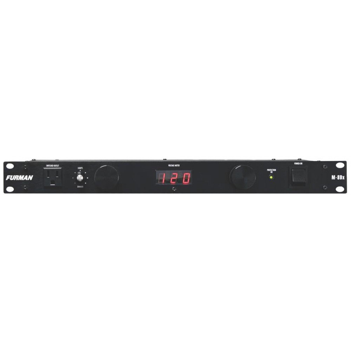 A Merit Series Power Conditioner is the perfect low-cost AC power solution for any rack mount system. Install an M-8Dx into the top slot of your rack, and the eight switched outlets in the rear panel will power up and protect all your equipment up to a 15-amp load. The M-8Dx features two slide out, swiveling light fixtures to provide discreet illumination of your equipment on stages, in studios, and in other dark places. A dimmer knob lets you adjust the lamp brightness to just the right level.The M-8Dx also features a bright red, three-digit LED voltmeter that displays incoming voltage.
