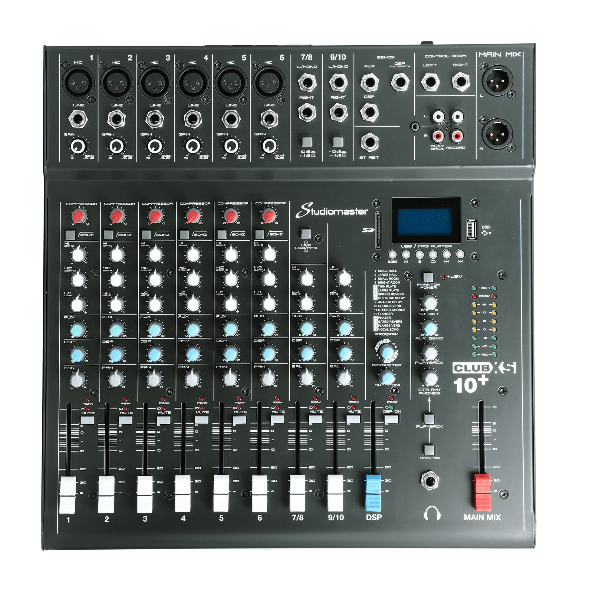 The Studiomaster CLUBXS+ series are a range of comprehensive and affordable compact, hard wearing mixing consoles. With all the features required for live mixing or stereo recording an event, duo or band whether at home, in the rehearsal rooms or out at an event.